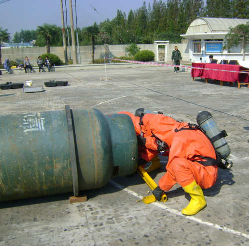 這次應急演習所有參賽人員堅持“安全第一”的原則。服從命令,聽從指揮,遵守競賽規(guī)則,服從裁判人員的裁決,遇到有爭議問題由本代表隊隊長與裁判人員進行交涉。競賽人員都正確穿戴好防化服、空氣呼吸器和防護手套,正確使用液氯泄漏堵漏裝置。