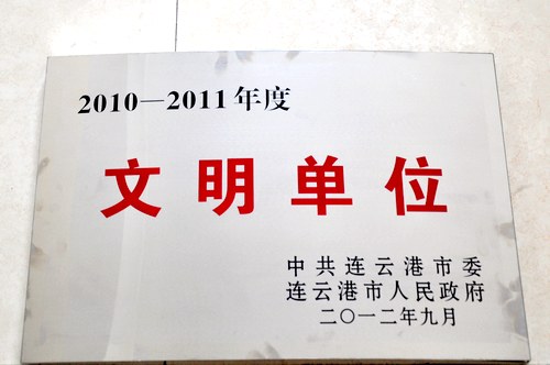 年度文明單位申創(chuàng)評比工作中,榮獲由中共連云港市委、連云港市人民政府頒發(fā)的“連云港市文明單位”稱號。