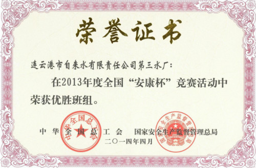 近日,從中華全國(guó)總工會(huì)、國(guó)家安全生產(chǎn)監(jiān)督管理總局傳來(lái)喜訊,公司第三水廠獲2013年度全國(guó)“安康杯”競(jìng)賽優(yōu)勝班組榮譽(yù)稱號(hào)。