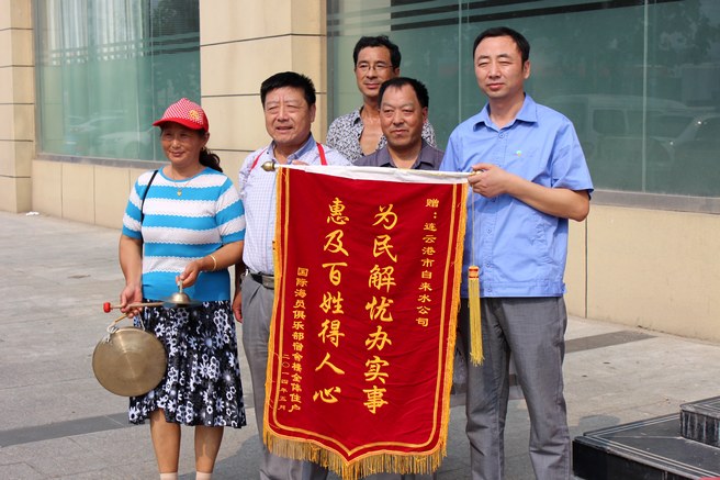 蒼梧晚報(bào)8月8日訊 8月5日,來(lái)自連云區(qū)海員俱樂(lè)部宿舍樓的居民代表韓永剛、洪度財(cái)?shù)热,將一面錦旗送到市自來(lái)水公司,感謝供水部門為居民解決了多年用水難問(wèn)題,讓大家吃上放心水。