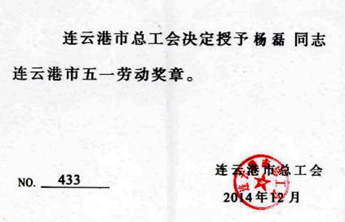 楊磊同志榮獲連云港市“五一”勞動獎?wù)?/span>