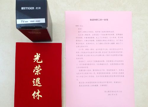 即將退休的職工在原先各自的崗位上,勤奮工作、努力進取、不斷創(chuàng)新,創(chuàng)造了一個又一個成績,為公司健康發(fā)展、和諧發(fā)展做出了不懈的努力,為公司留下了最為寶貴的精神財富。為進一步表達對即將退休職工的關(guān)愛,感謝他們?yōu)楣舅鞒龅呢暙I,讓職工切身感受到公司的溫暖,2015年5月起,公司工會將為每位即將退休的職工遞上一封感謝信、頒發(fā)《光榮退休證》、送上一份紀念品。衷心的祝愿他們退休以后的生活豐富多彩,老有所為,老有所樂,繼續(xù)發(fā)揮余熱,關(guān)心支持供水事業(yè)的發(fā)展,并祝福他們身體健康,家庭幸福!