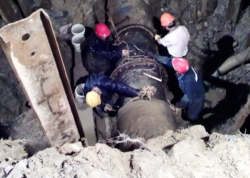 22日深夜,連云區(qū)港城大道附近一處DN500的管線發(fā)生爆裂,接到報修后,公司相關(guān)部室、單位迅速采取緊急處理措施,水廠降壓、停止部分區(qū)域供水等,并組織相關(guān)施工人員趕到事故現(xiàn)場。從22日深夜零點到24日凌晨4點,公司的搶修人員晝夜不息,冒雨施工!在深5米的管溝內(nèi)搶修管道時,因為雨量大,曾出現(xiàn)塌方,搶修人員及時避讓,未出現(xiàn)人員受傷情況,隨后,現(xiàn)場負(fù)責(zé)人馬上采取用鋼板在周邊固定等方式,避免再次出現(xiàn)塌方!搶修人員加班加點,冒雨不間斷搶修,終于在凌晨3點恢復(fù)供水,4點半完成施工現(xiàn)場恢復(fù)等后續(xù)工作。搶修比預(yù)計時間提前三小時完成,有效降低了公司的產(chǎn)銷差。