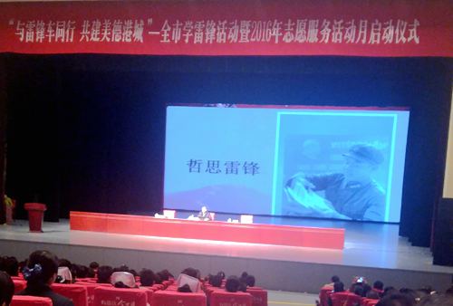 啟動儀式結(jié)束后,《雷鋒》雜志的主編陶克將軍為現(xiàn)場的志愿者做了“永遠的雷鋒”的報告,闡述了雷鋒短暫的一生,令在場的志愿者深受感動和鼓舞。對于當代的年輕人來說,雷鋒這個人雖然早已離去,但是雷鋒的精神卻永遠都在,年輕人應(yīng)該繼續(xù)傳承雷鋒精神,使雷鋒精神成為中國永遠的不會抹去的精神!