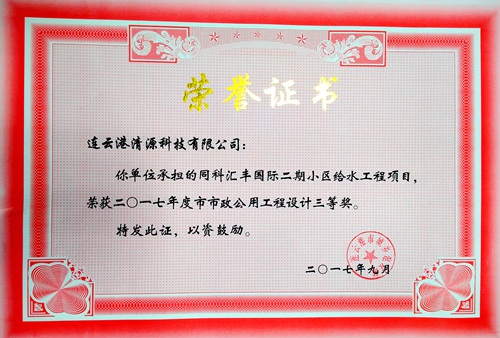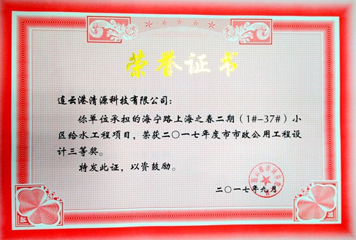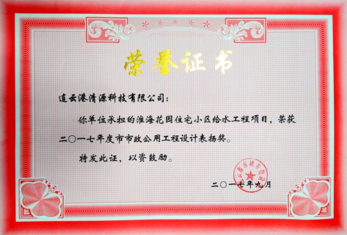 在本年度連云港市城鄉(xiāng)建設(shè)局組織的“2017年度連云港市城鄉(xiāng)建設(shè)系統(tǒng)優(yōu)秀勘察設(shè)計評選”活動中,由公司技術(shù)部設(shè)計的多個給水工程項目通過專家組評選,榮獲市政公用工程優(yōu)秀設(shè)計三等獎3項,市表揚獎1項,獲獎項目主要設(shè)計人員有:徐艷玲、史俊陽、吳敏、臧玉強、童心、趙海云、楊雪等。