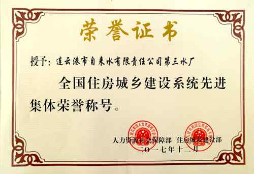 2017年12月14日,中華人民共和國人力資源社會(huì)保障部、住房城鄉(xiāng)建設(shè)部印發(fā)《關(guān)于表彰全國住房城鄉(xiāng)建設(shè)系統(tǒng)先進(jìn)集體 先進(jìn)工作者和勞動(dòng)模范的決定》(人社部發(fā)〔2017〕93號(hào)),連云港自來水公司第三水廠喜獲“全國住房城鄉(xiāng)建設(shè)系統(tǒng)先進(jìn)集體”榮譽(yù)稱號(hào),這是第三水廠繼榮獲“全國安康杯競賽優(yōu)勝單位”后獲得的又一殊榮。此次江蘇省榮獲“全國住房城鄉(xiāng)建設(shè)系統(tǒng)先進(jìn)集體”榮譽(yù)的共有十四家單位或集體,連云港市僅有連云港自來水公司第三水廠一家獲此殊榮。