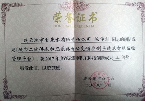 1月30日,全市職工創(chuàng)業(yè)創(chuàng)新工作總結(jié)表彰會(huì)在市總工會(huì)舉行。公司工會(huì)推薦的陳學(xué)劍同志的創(chuàng)新成果《城市二次供水加壓泵站自動(dòng)變頻控制系統(tǒng)及智能監(jiān)控管理平臺(tái)》,榮獲2017年度連云港市職工科技創(chuàng)新成果三等獎(jiǎng),得到市總工會(huì)獎(jiǎng)勵(lì)5000元。