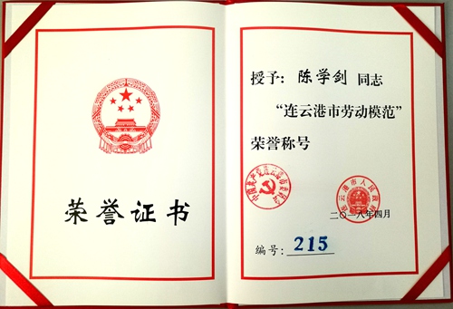 近日,連云港市召開勞模表彰大會,我公司陳學劍同志榮獲2015—2017年度連云港市勞動模范稱號。