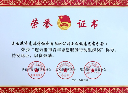 2018年4月,共青團(tuán)連云港市委、市文明辦、市志愿者協(xié)會(huì)聯(lián)合開展了2017年度全市青年志愿者行動(dòng)評(píng)選表彰活動(dòng)。經(jīng)評(píng)審委員會(huì)資格審查、組織評(píng)選等程序,從組織開展志愿服務(wù)活動(dòng)成效、組織的管理和運(yùn)行、使用志愿者打卡器開展活動(dòng)等方面綜合評(píng)選,公司“小白鴿志愿者分會(huì)”榮獲“連云港市青年志愿服務(wù)行動(dòng)組織獎(jiǎng)”稱號(hào)。