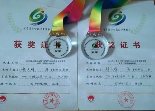 近日,從連云港市全民健身運動會傳來喜訊,公司趙義峰同志獲得2018連云港市首屆全民健身運動會游泳比賽暨市第三屆游泳錦標賽100米蛙泳第一名、50米蛙泳第二名。
