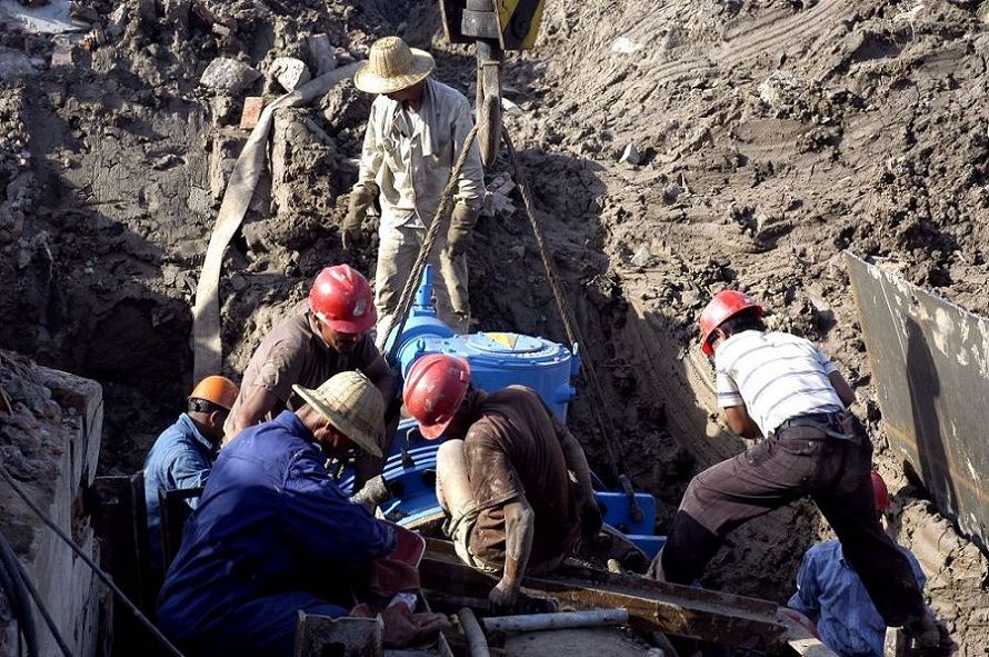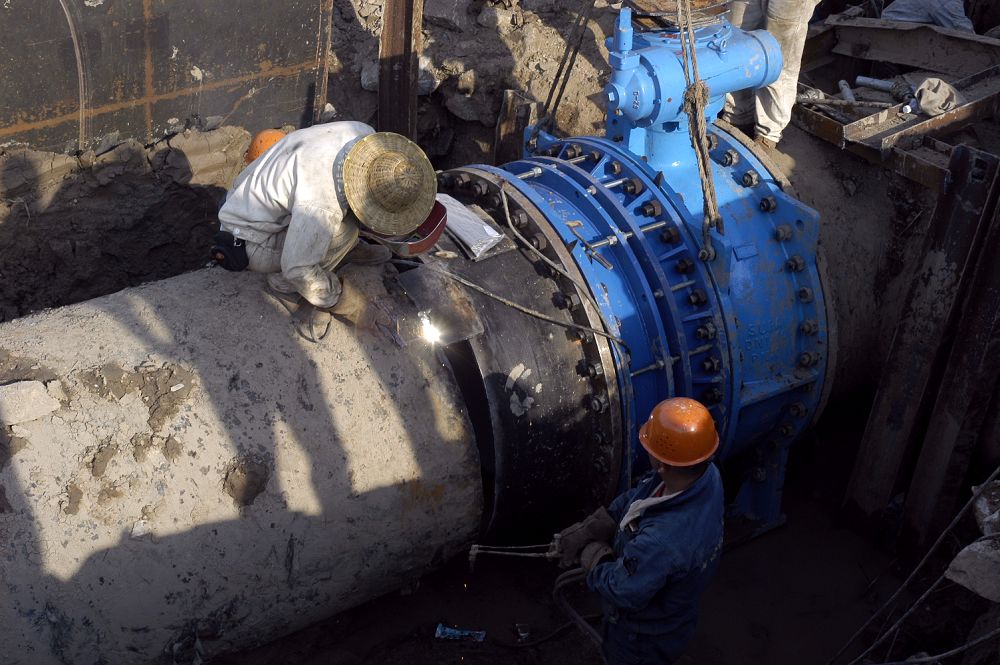 第三水廠1400毫米出廠水管線從茅口路第三水廠門口至解放東路,全長約1400米, 其中1400毫米球墨鑄鐵管1000米,鋼管400米,工程造價900萬元,全部由市自來水公司投資建設(shè),工程竣工后,將大大提高水廠向市區(qū)的輸水能力,進一步保障市區(qū)(特別是東部城區(qū))夏季高峰用水需求。圖為施工人員在對供水管線進行焊接。
