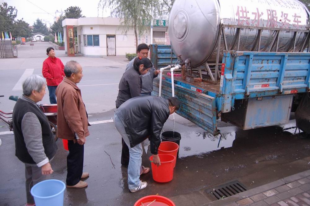 因供水管道老化嚴(yán)重,新孔南路近日開始更換新供水管道,受此影響,沿線2000余戶居民及部分單位從5日起開始停水。為確保居民正常生活不受影響,市自來水公司安排10噸容量的應(yīng)急供水車開進(jìn)小區(qū)24小時(shí)為居民送水。(圖為應(yīng)急供水車在向新孔南路沿線居民送水)