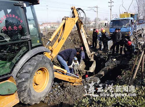 22日中午,有市民向市自來水公司客服熱線反映,在港城大道猴嘴閘附近,有一處主水管道破裂,噴出的自來水猶如噴泉,市自來水公司立即指示連云分公司派人趕赴現(xiàn)場進(jìn)行搶修。施工人員到現(xiàn)場后,通過專用探測儀器探測發(fā)現(xiàn),水管破裂處是一根埋在地下的800毫米的主水管道。施工人員立即現(xiàn)場制定了搶修方案,迅速控制和關(guān)閉總閥門,同時(shí)調(diào)集挖掘工具,冒著零下9℃的嚴(yán)寒,連夜挖到地下4米的深度。整個(gè)搶修工程緊張而忙碌,由于施工難度比較大,他們在挖掘過程中,處處都必須精心作業(yè),在不斷向深度挖掘中,施工人員浸在4米多深的水坑里,他們克服了許多意想不到的困難,施工時(shí)避開埋在水管邊上的煤氣管道和上面的通訊電纜,到當(dāng)天夜間11時(shí)許,他們終于準(zhǔn)確地找到了主水管破裂點(diǎn)。